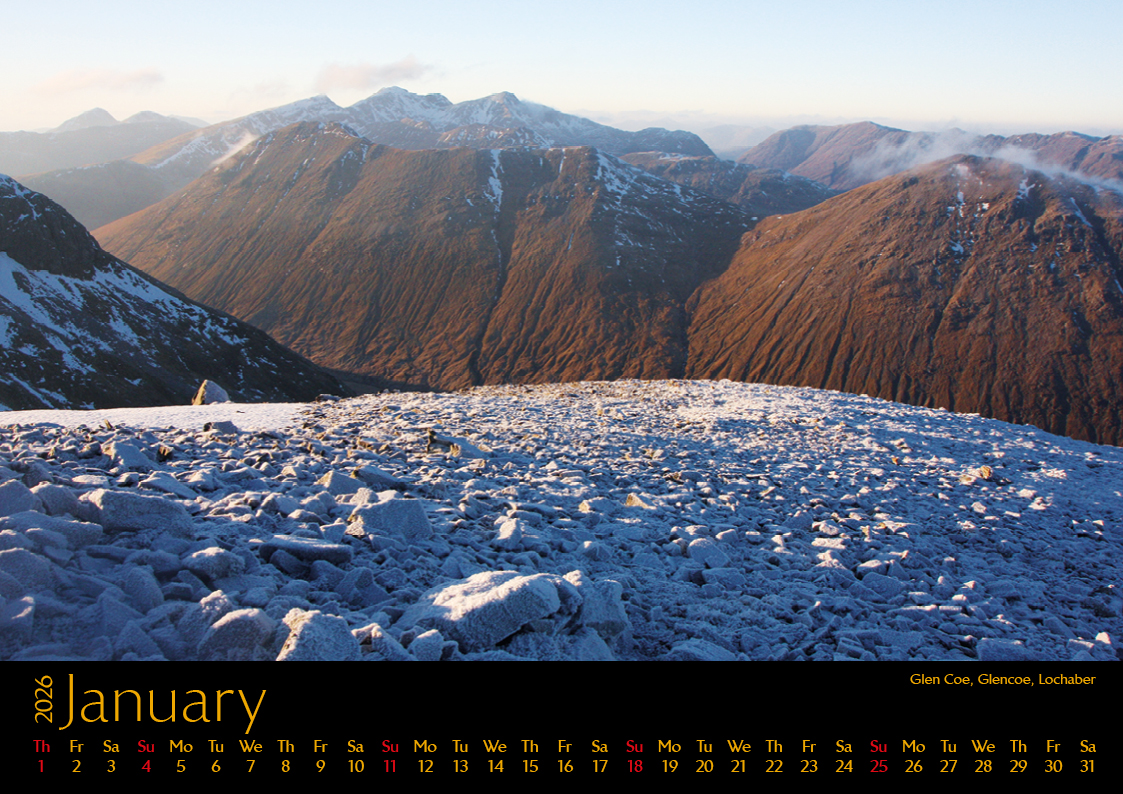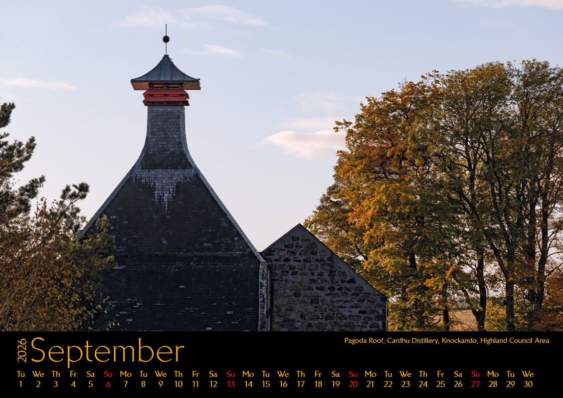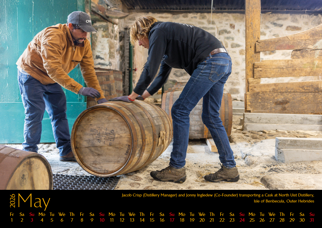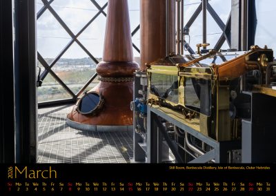 Kupfer und poliertes Messing glänzen magisch im Sonnenlicht. Der „Still Room“ der Benbecula-Brennerei ist ein Glaspalast. Zu finden ist das architektonische Juwel auf den äußeren Hebrideninseln. In der wilden Landschaft entsteht gerade eine neue Whiskykultur. Bis ins Fasslager der North Uist Brennerei bringt uns der neue „Scotland-Land of Whisky“-Kalender 2026. Der Bildkalender für Schottland-und Whiskyfans führt durch Highlands und Islands bis auf Großbritanniens höchsten Berg, den Ben Nevis. Und er wirft einen Blick auf die Kathedrale von Elgin und das Häusermeer der Metropole Glasgow.